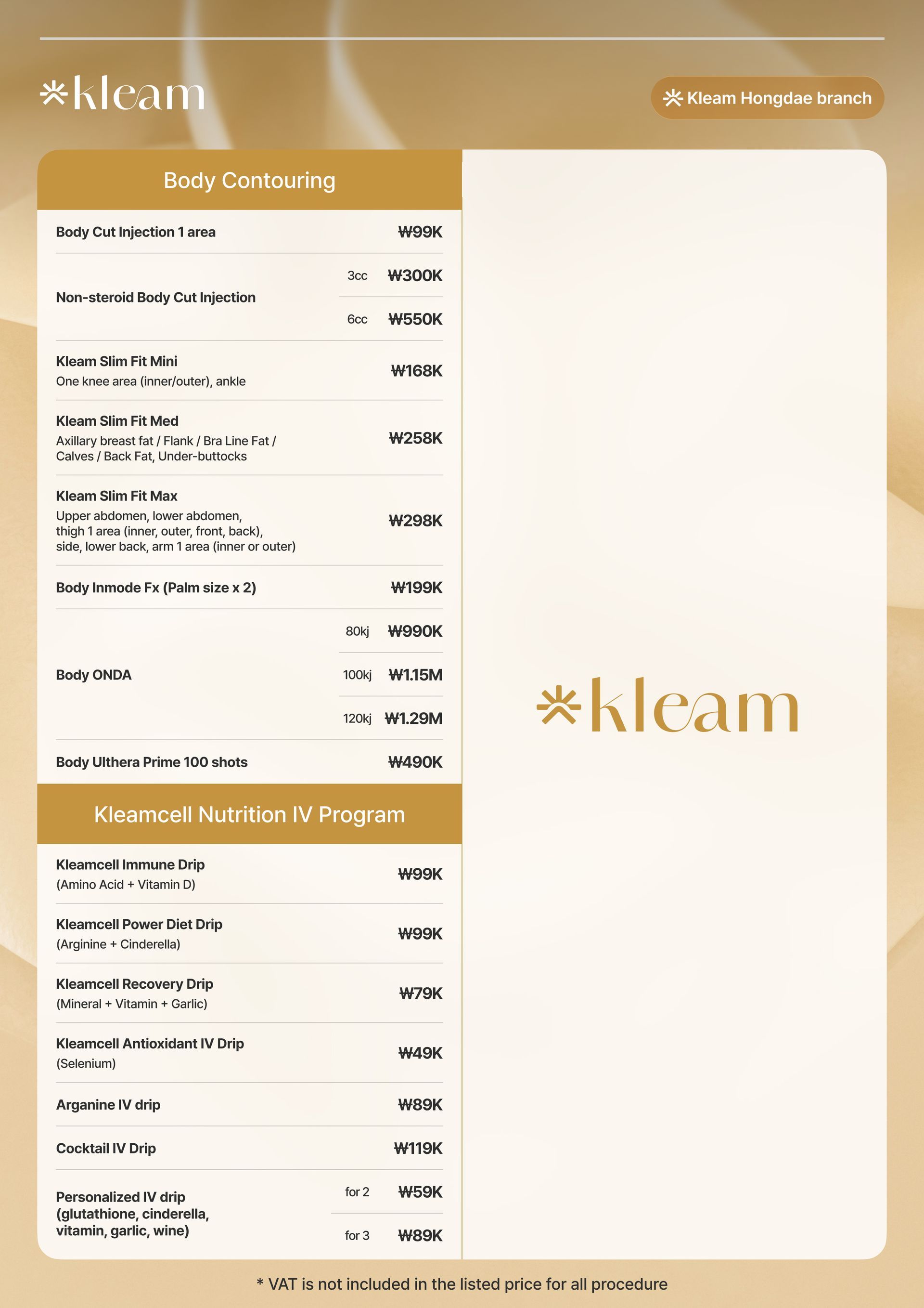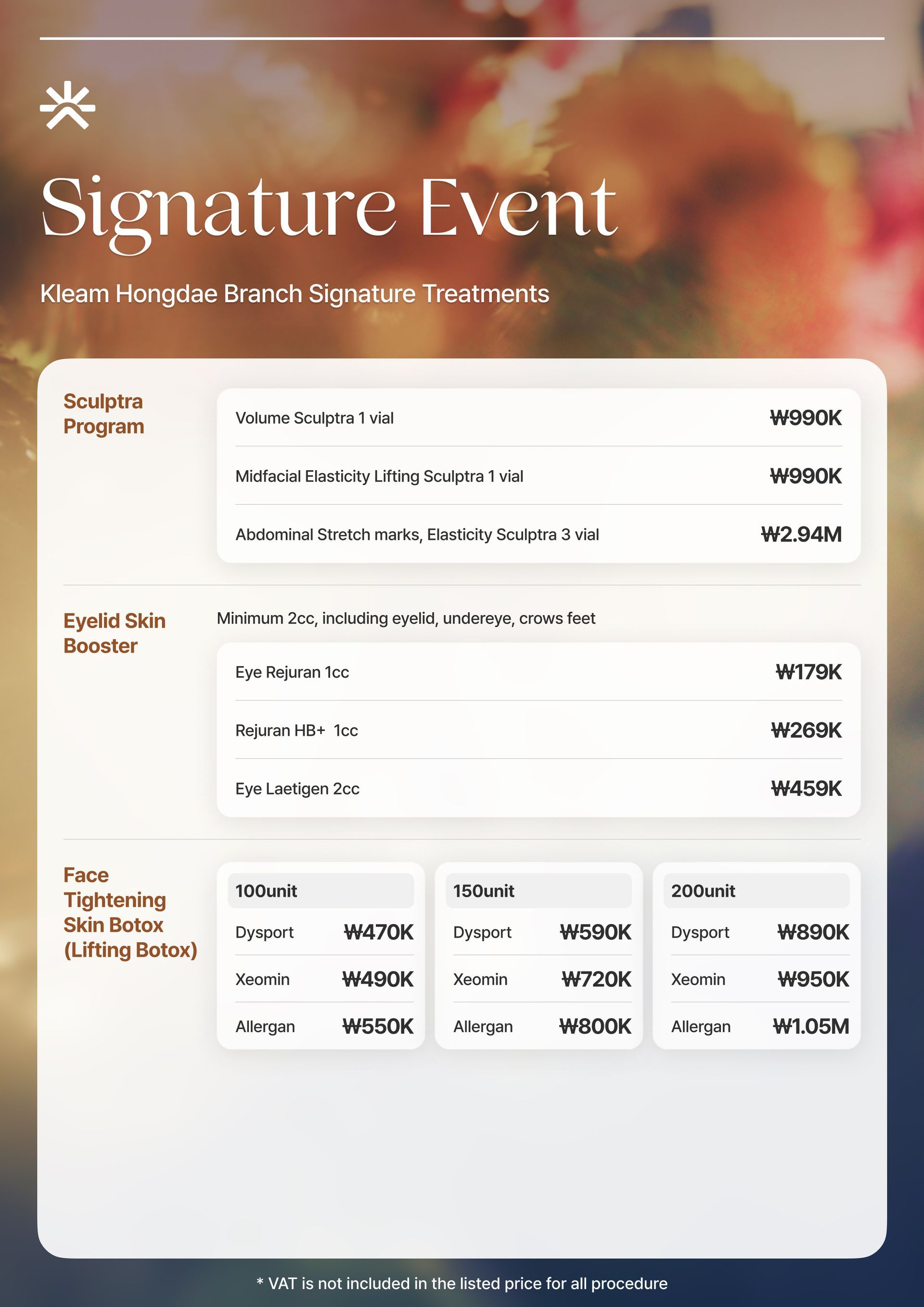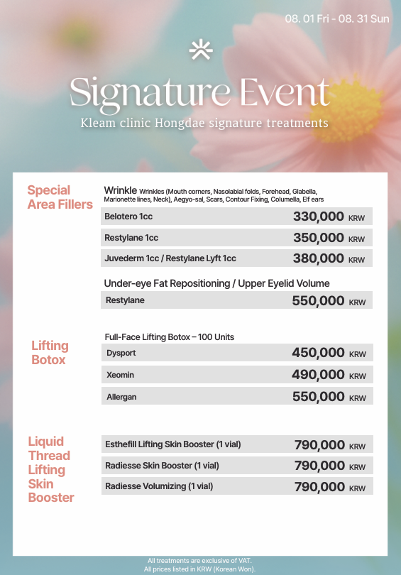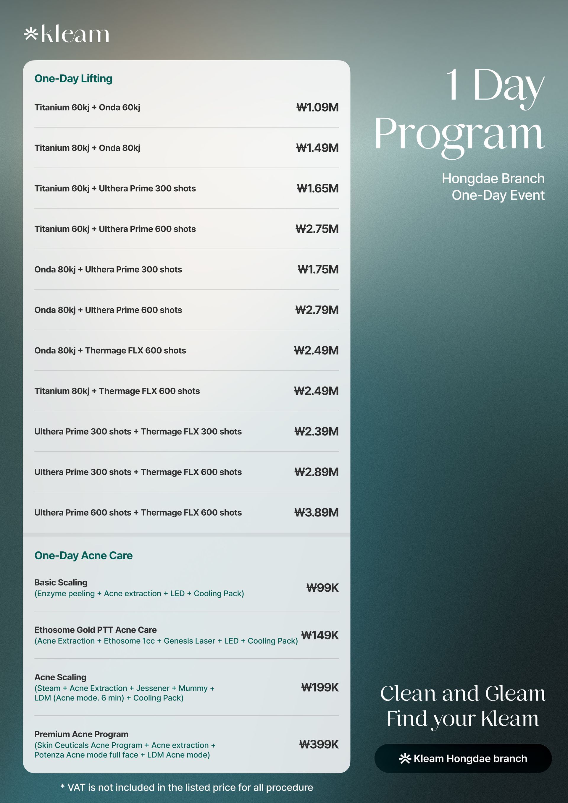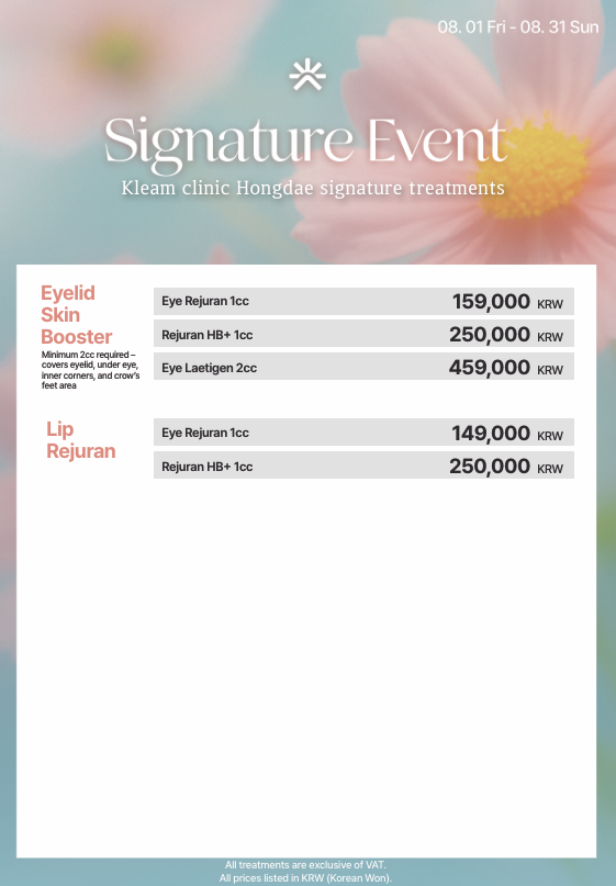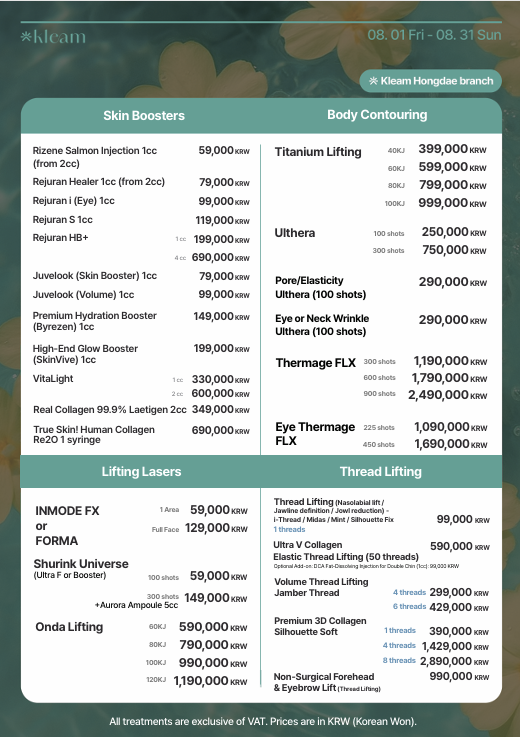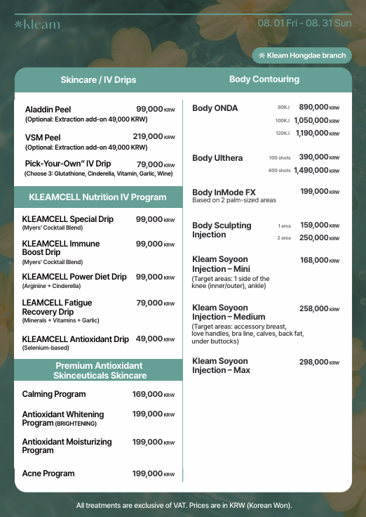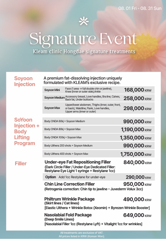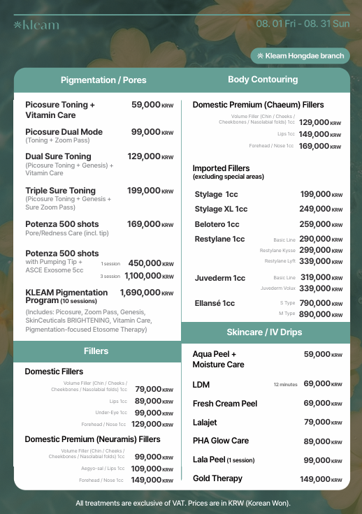 弘大 Kleam 診所 (Hongdae Kleam Clinic) 是韓國領先的醫美診所,提供全面的醫美療程,包括雷射皮膚治療、肉毒桿菌、填充劑、音波拉提 (ULTHERAPY)、電波拉提 (THERMAGE)、麗珠蘭 (REJURAN HEALER)以及專業的皮膚護理方案。