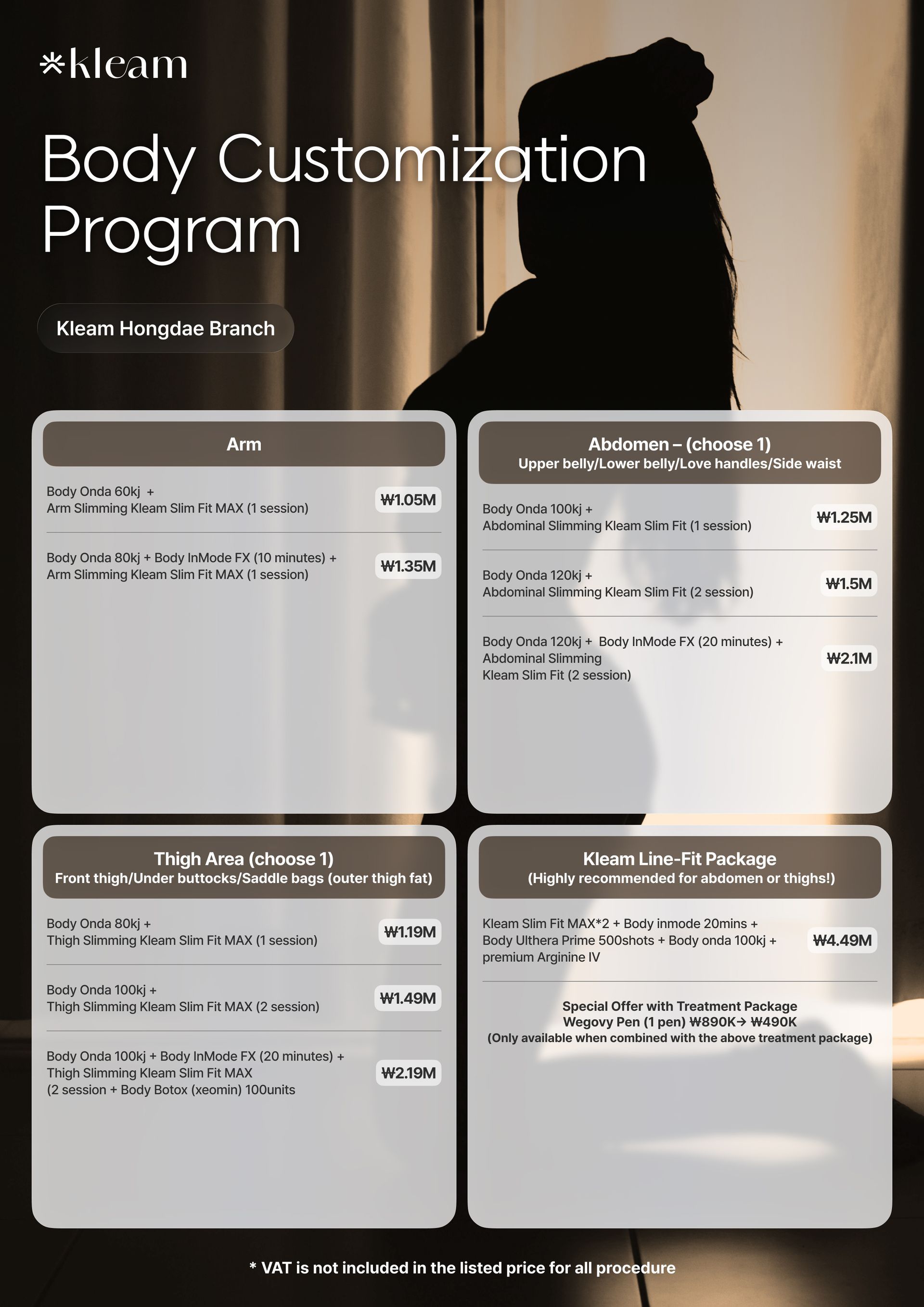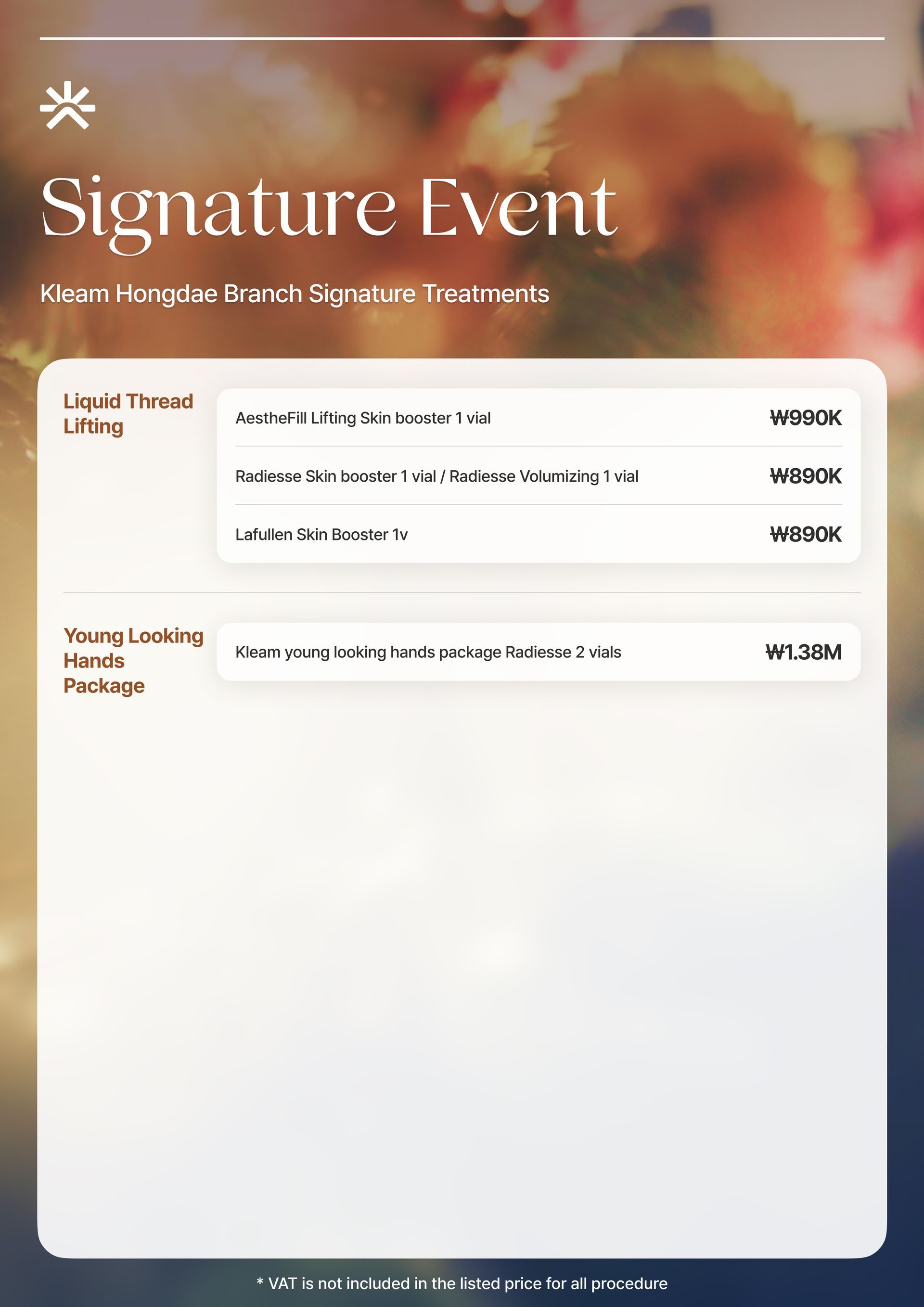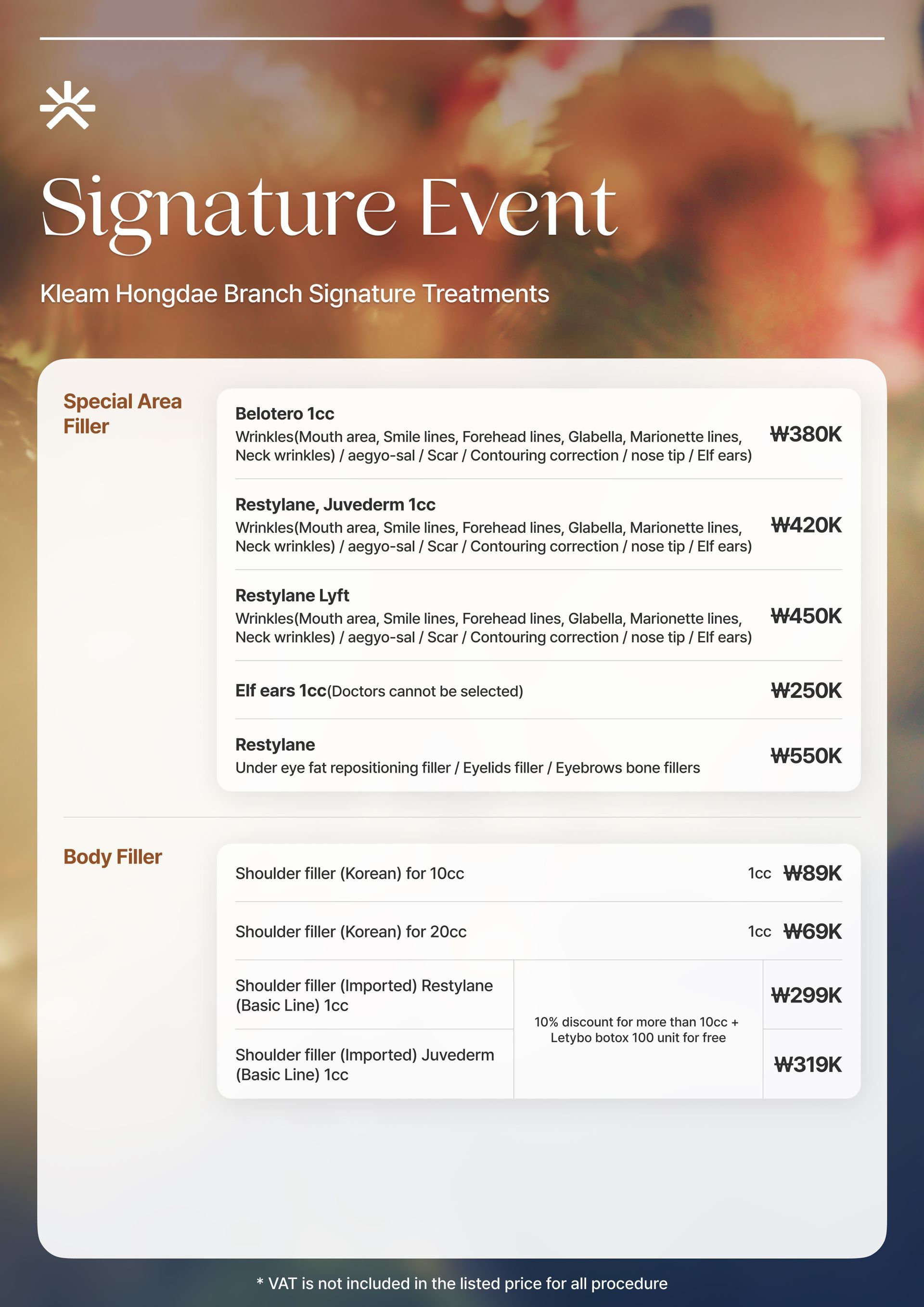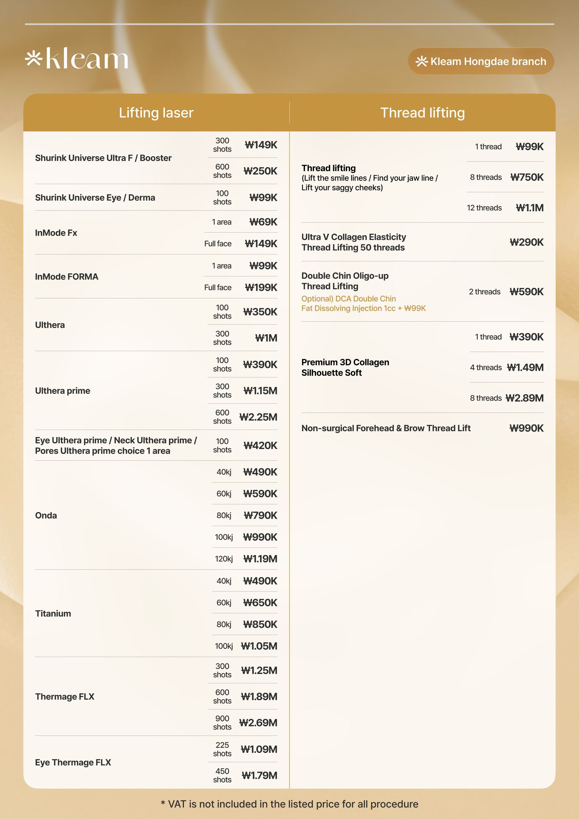 - 廣泛的療程選擇 診所提供多樣化的熱門醫美療程,包括雷射護膚、肉毒桿菌、填充劑,以及音波拉提 (ULTHERAPY) 和電波拉提 (THERMAGE) 等先進的拉提療程。這讓台灣顧客能夠在一個地方,就享受到多種受歡迎的「K-beauty」療程。